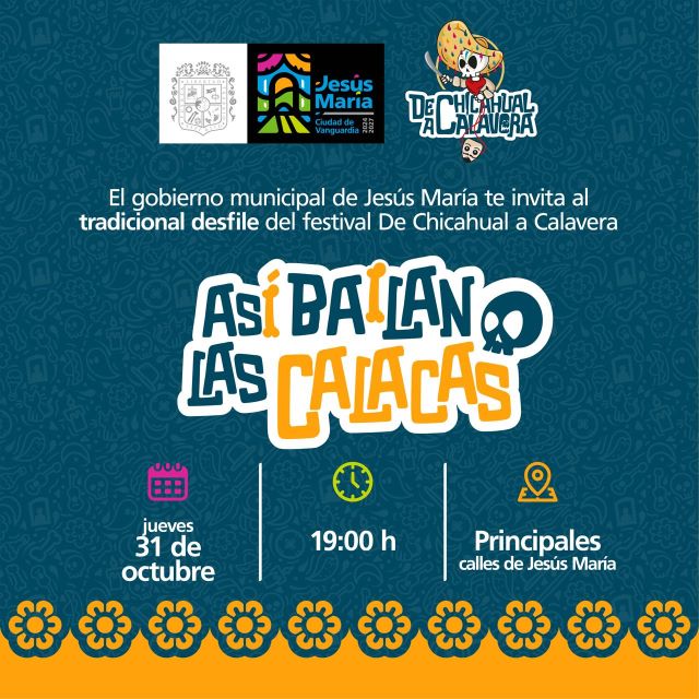 JESÚS MARÍA, AGS.- El Gobierno Municipal de Jesús María, a través de la Instancia de Cultura, invita a la ciudadanía en general al desfile “Así bailan las calacas”, que se llevará a cabo el 31 de octubre.