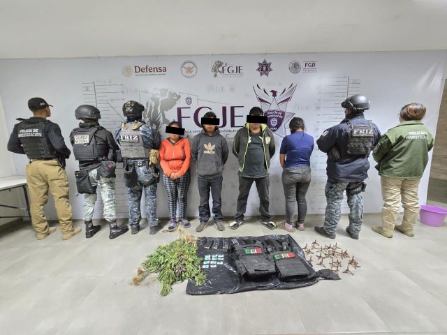 TEÚL DE GONZÁLEZ ORTEGA, ZAC.- En la comunidad de Milpillas de Allende, perteneciente a Teúl de González Ortega, fueron detenidas cuatro personas señaladas como posibles integrantes de una célula delincuencial; además, se logró el resguardo de cuatro menores de entre 2 y 11 años, así como el aseguramiento de droga, cargadores, equipo táctico y un vehículo.