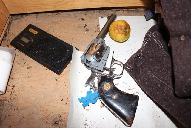 El propio MP, policías ministeriales y peritos se presentaron en la casa de los detenidos para llevar a cabo el cateo, encontrando en una habitación, dentro de un cajón de un tocador de madera, un arma de fuego corta tipo revólver, calibre .38 especial, en color plata, y una báscula gramera.