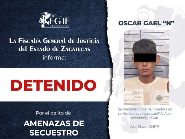 GUADALUPE, ZAC.- El equipo de investigación adscrito a la Fiscalía Especializada en Delitos de Alto Impacto, en colaboración con la Secretaría de Seguridad y Protección Ciudadana, lograron la detención de Óscar Gael “N” en el municipio de Guadalupe ya que contaba con una orden de aprehensión por el delito de amenazas de secuestro.