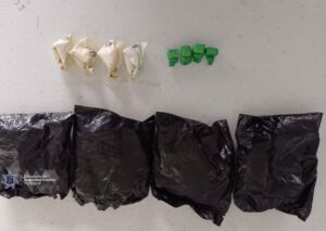 • Cuatro envoltorios de plástico blanco con polvo blanco granulado con las similitudes de la sustancia conocida como cocaína.