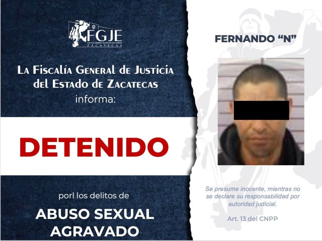 Fernando “N” fue detenido en el municipio de Fresnillo debido a que contaba con una orden de aprehensión por el delito de abuso sexual agravado.