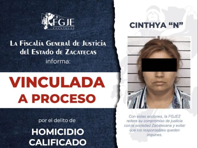 Conforme a las principales diligencias, la Unidad Especializada de Homicidios Dolosos de la Vicefiscalía Distrital de Fresnillo logró establecer mediante una prueba científica que la causa de muerte fue producto de un hecho violento; asimismo, mediante al avance de la investigación se logró establecer la identidad de la probable responsable, obteniendo así una orden de aprehensión en su contra, lo que permitió mediante acciones de investigación e inteligencia lograr la detención de Cinthya “N”.