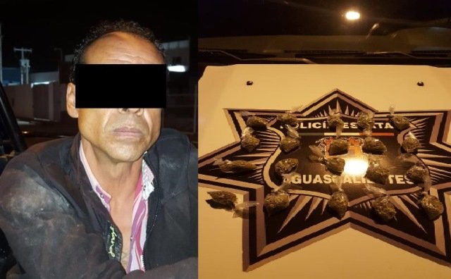 AGUASCALIENTES, AGS.- Elementos de la Secretaría de Seguridad Pública del Estado llevaron a cabo la detención de un presunto distribuidor de droga originario de Zacatecas, el cual llevaba en su poder 20 envoltorios con marihuana, que dio un peso de 150 gramos, por lo que ya se encuentra a disposición del Agente del Ministerio Público del fuero común.