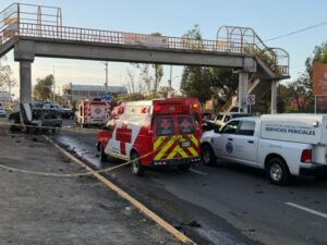 AGUASCALIENTES, AGS.- Dos hombres y una mujer perdieron la vida la tarde del domingo 1 de marzo luego de que el vehículo en el que viajaban se impactara contra el pilar de un puente peatonal y se incendiara sobre la carretera federal 70 Poniente, a la altura del kilómetro 12, en la entrada a la comunidad La Tomatina, en el municipio de Jesús María.