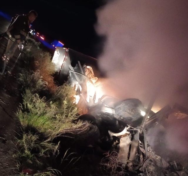 RÍO GRANDE, ZAC.- Dos muertos calcinados, un adulto y un menor de edad, y una mujer lesionada dejó como saldo la volcadura y posterior incendio de un camión quinta rueda.
