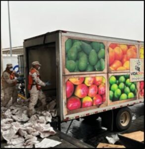 Derivado de lo anterior y de la planeación operativa, personal del Ejército Mexicano e integrantes de la Guardia Nacional desplegados en el Puesto Militar de Seguridad Estratégico “Querobabi”, municipio de Opodepe, Sonora, al observar que se aproximaba un vehículo con las características de las que se tenía conocimiento, en el que se transportaban dos personas, establecieron un dispositivo de seguridad con la finalidad de conducirlo al área de revisión y posteriormente canalizarlo al área de inspección del equipo de rayos gamma Full Scan, localizando 577 envoltorios de plástico en la carga que transportaba el automotor, mismos que en su interior contenían lo siguiente: