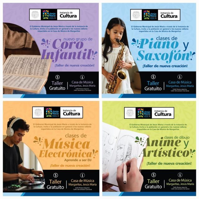 JESÚS MARÍA, AGS.- El Gobierno Municipal de Jesús María, a través de la Instancia de Cultura, invita a la ciudadanía en general a participar en los nuevos talleres que se impartirán en las instalaciones de la Casa de Música de Margaritas.