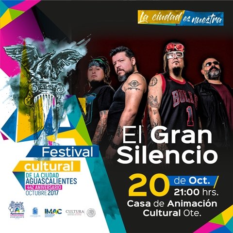 AGUASCALIENTES, AGS.- Este viernes 20 de octubre en punto de las 21:00 horas, el Ayuntamiento de Aguascalientes te invita a disfrutar y a bailar al ritmo de “El Gran Silencio” y su “Chuntaro Style”, fusión de vallenato, regué y otros géneros que dan vida a composiciones características de la agrupación regiomontana.