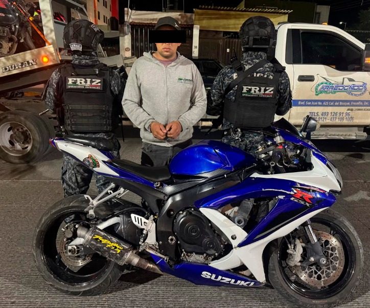 FRESNILLO, ZAC.- Elementos de la Fuerza de Reacción Inmediata Zacatecas (FRIZ) lograron la detención de un masculino que circulaba en una motocicleta con reporte de robo vigente en la colonia Emiliano Zapata, en el municipio de Fresnillo.