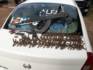 Una vez que constataron que la camioneta estaba abandonada revisaron el interior de la misma y localizaron un arma de fuego larga tipo fusil, calibre .223 milímetros, con su respectivo cargador y un arma de fuego corta tipo escuadra, calibre 9 milímetros, también con su cargador.
