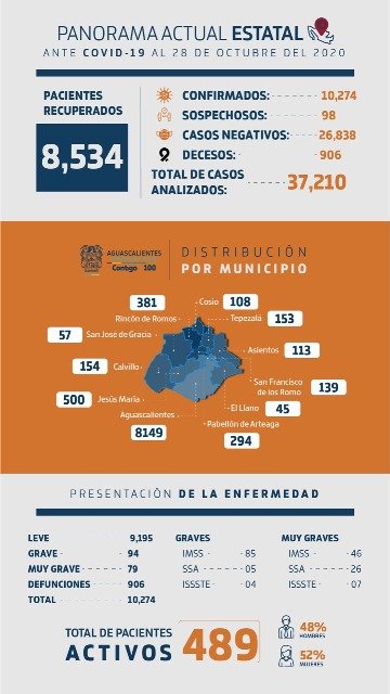 A través del informe técnico emitido por el Instituto de Servicio de Salud del Estado de Aguascalientes (ISSEA), se indica que hasta el 28 de octubre se han aplicado 37 mil 210 pruebas en todo el Estado de Aguascalientes, de los cuales 26 mil 838 han sido negativos y hay 489 pacientes activos que están distribuidos en los 11 municipios.