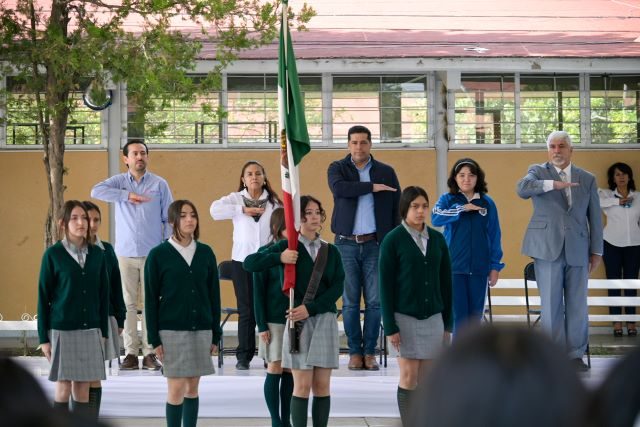 AGUASCALIENTES, AGS.- El presidente municipal de Aguascalientes, Leo Montañez, presidió la ceremonia de honores a la bandera en la escuela secundaria número 13 “Ricardo Flores Magón”, evento en el cual refrendó su compromiso de promover los valores cívicos y la identidad nacional; aseguró que se reafirma el compromiso con la historia, con las raíces, así como con el futuro que se construye juntos.