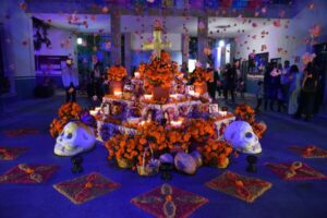 Posteriormente, el artista Édgar Herrera presentó la mega ofrenda, una instalación inspirada en la tradición del Día de Muertos y dedicada al arte mexicano.