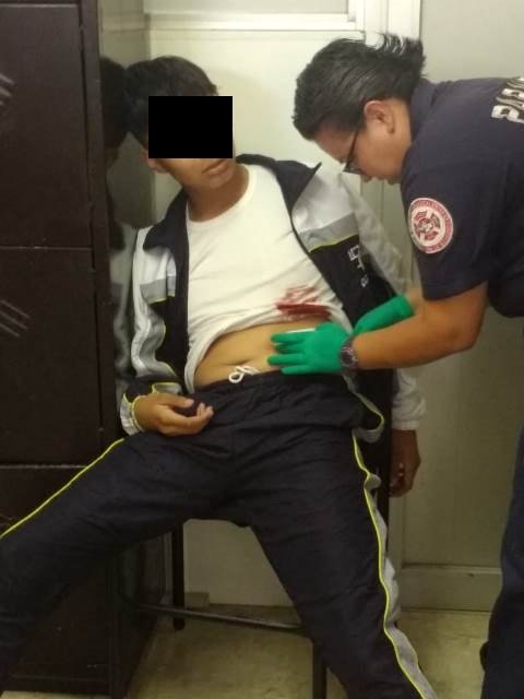 A la escuela acudieron policías preventivos y paramédicos de la Coordinación Municipal de Protección Civil en la ambulancia UE-13, que lo auxiliaron y le diagnosticaron una herida punzocortante en el abdomen del lado izquierdo, tras de lo cual lo trasladaron a recibir atención al Hospital General de Zona número 3 del Seguro Social.