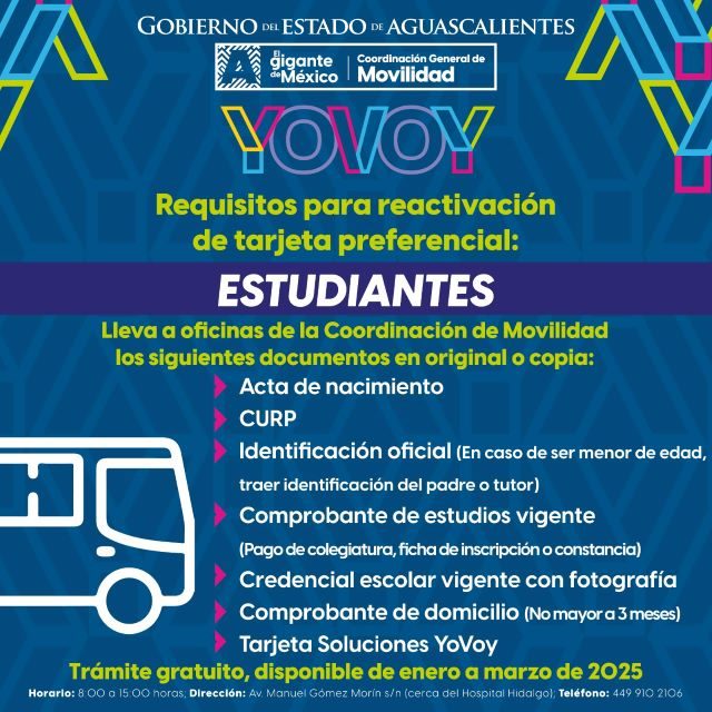 AGUASCALIENTES, AGS.- Este 2 de enero se abrió la convocatoria del Gobierno del Estado de Aguascalientes para que las y los estudiantes tramiten por primera vez o reactiven su Tarjeta Soluciones YoVoy, que les brinda acceso a la tarifa preferencial en los camiones urbanos.