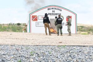 FRESNILLO, ZAC.- Narcóticos decomisados en operativos contra el narcomenudeo fueron incinerados por la Fiscalía General de Justicia de Zacatecas y el 97º Batallón de Infantería de la SEDENA en Fresnillo.