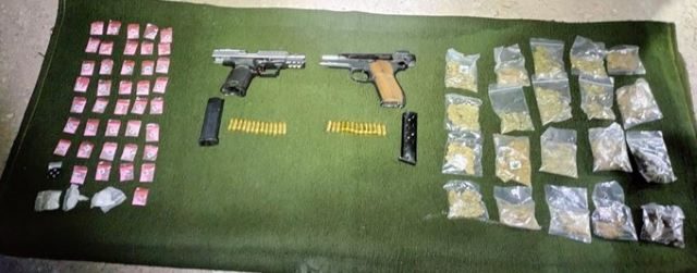 En la inspección se aseguró un arma de fuego con nueve cartuchos útiles a José H., y otra pistola del mismo calibre con quince cartuchos a Alejandro R.; además, se localizaron cuarenta bolsas con clorhidrato de metanfetamina y veinte bolsas con marihuana en una bolsa plástica colgada del manubrio de la motocicleta.