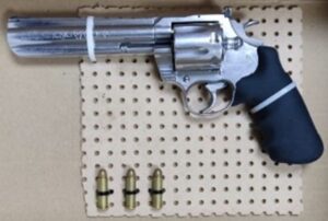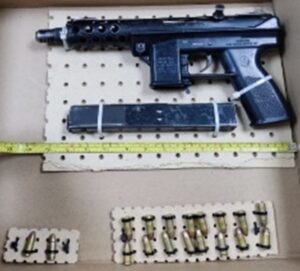 Durante la inspección se localizó en una mochila tipo escolar un arma de fuego tipo subametralladora con un cargador y 18 cartuchos útiles, un arma de fuego tipo revólver, 13 bolsas con marihuana, cinco bolsas con metanfetamina y tres envoltorios con cocaína.