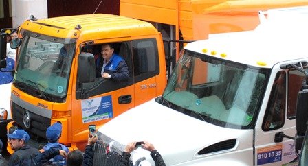 AGUASCALIENTES, AGS.- Con el propósito de reforzar la calidad de los servicios públicos que el Gobierno Municipal ofrece a la ciudadanía, el alcalde de Aguascalientes, Juan Antonio Martín del Campo, entregó tres camiones compactadores, cuatro camiones cisterna, seis camionetas y herramienta manual a la Secretaría de Servicios Públicos.