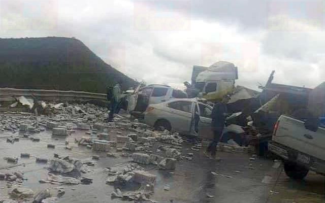 LUIS MOYA, ZAC.- Tres personas lesionadas fue el saldo que dejó un fuerte accidente sobre la carretera federal 45, en el tramo Zacatecas-Aguascalientes, y en el que se vieron involucrados un camión quinta rueda que transportaba cerveza, un camión de carga liviana, dos camionetas y un auto compacto.