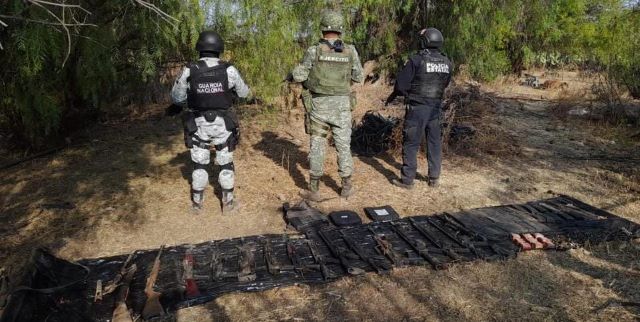 Dicho aseguramiento derivó de una acción conjunta entre personal del Ejército Mexicano, Guardia Nacional y la Fuerza de Reacción Inmediata (FRIZ) de la Policía Estatal Preventiva, quienes, mediante reconocimientos terrestres y patrullajes de disuasión del delito realizados en la localidad de Salinas de Hidalgo, del municipio antes señalado, aseguraron 15 armas de fuego largas.