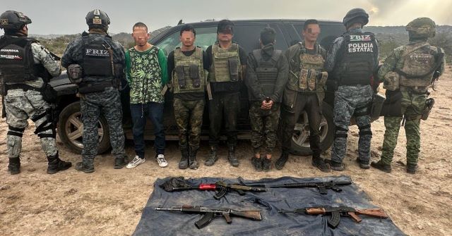 A estas personas les fueron aseguradas cuatro armas de fuego largas, cuatro chalecos balísticos, cartuchos, cargadores, 48 dosis de una sustancia granulada con las características de la droga conocida como crystal y una camioneta Chevrolet Blazer, que cuenta con reporte de robo.
