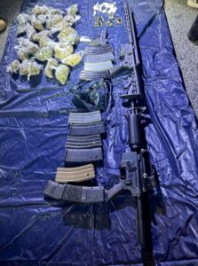 Durante la operación se aseguraron dos armas de fuego largas, un arma corta, 12 cargadores de diferentes calibres, 14 bolsas con sustancia granulada con características de la droga conocida como crystal, y 33 bolsas de hierba verde, al parecer marihuana.