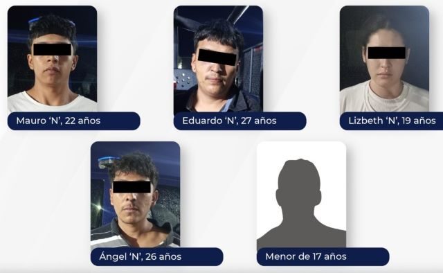 Por lo anterior, se procedió con la detención de las cinco personas, identificadas como Lizbeth “N”, de 19 años; Mauro Iván “N”, de 22 años; Ángel “N”, de 26 años; Eduardo “N”, de 27 años; y un menor de 17 años de edad.