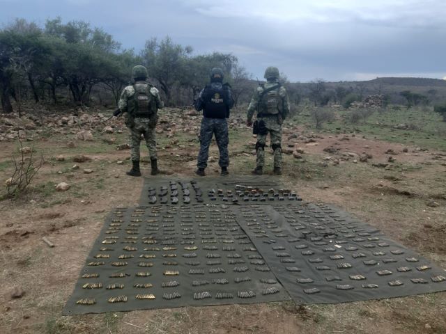 En ese sitio fueron localizados y asegurados 28 cargadores y 4 mil 401 cartuchos útiles de diferentes calibres, así como rastros de basura, alimentos y diversos artículos de uso personal, que fueron destruidos para evitar su reutilización.