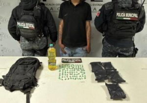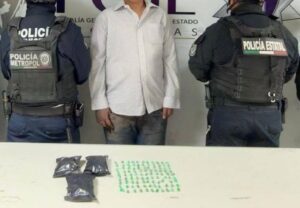 Derivado de estos hechos y como parte de las acciones de seguimiento, en la colonia González Ortega elementos de la Policía Estatal Preventiva, Policía Municipal y Policía Metropolitana detuvieron a Arturo “N”, de 48 años, a quien, tras una inspección, se le aseguraron 100 envoltorios con sustancia con características de crystal y diversas bolsas con hierba verde y seca con características de marihuana.