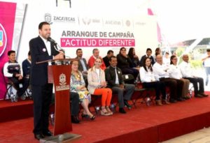 JEREZ, ZAC.- Ante cientos de jóvenes estudiantes, el Gobernador Alejandro Tello presentó la nueva campaña Actitud Diferente, a través de la cual se implementarán estrategias, campañas y programas de prevención de adicciones en jóvenes, educación sexual, inclusión de personas con discapacidad, atención a la violencia en el noviazgo, nutrición y otros.