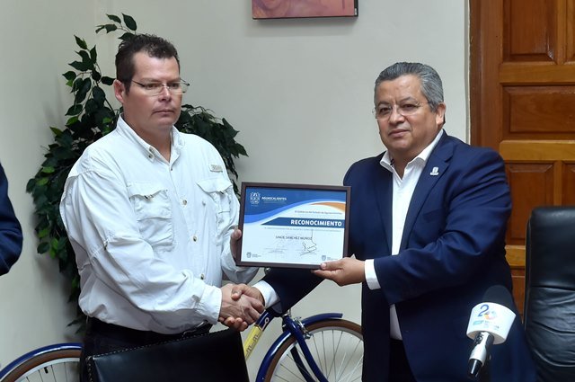 Por su parte, el Coordinador General de Movilidad, Oscar Aragón Jiménez, a nombre de todo el personal que labora en la dependencia a su cargo, entregó una bicicleta a Sánchez Muñoz, como parte del fomento de una cultura del uso de este medio de transporte como una alternativa económica, saludable y ecológica para trasladarse.