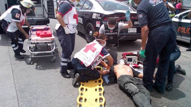 Al lugar se dirigieron el médico de vuelo del helicóptero Halcón 1 de la Secretaría de Seguridad Pública Municipal, doctor Eduardo Álvarez Bravo, y paramédicos de la Cruz Roja, que le brindaron los primeros auxilios a la víctima y le diagnosticaron un traumatismo craneoencefálico severo, una herida corto-contusa en la región occipital de cráneo y probable fractura de clavícula derecha.