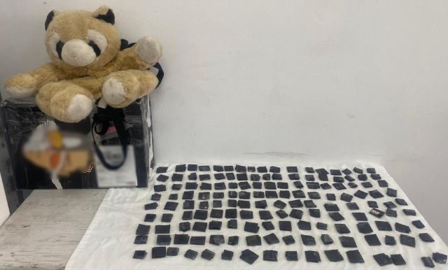 Dentro del paquete había un muñeco de peluche que ocultaba en su interior tres bolsas transparentes con aproximadamente 150 dosis de polvo blanco con las características del narcótico conocido como cocaína.