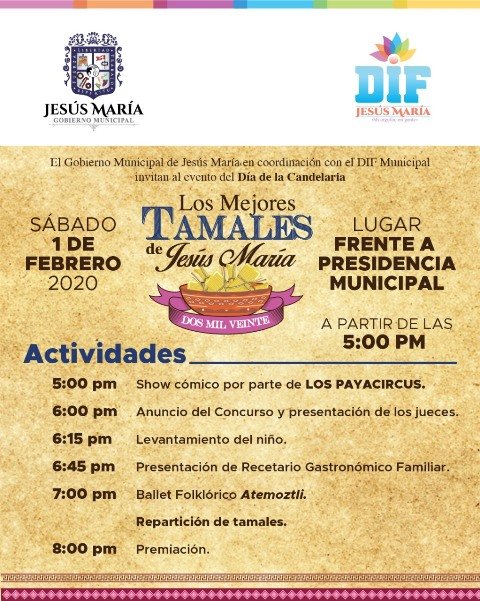 JESÚS MARÍA, AGS.- Este sábado 1 de febrero, el DIF de Jesús María celebrará el Día de la Candelaria con el evento “Los mejores tamales de Jesús María”, el cual se llevará a cabo en la explanada del Palacio Municipal a partir de las 5 de la tarde.