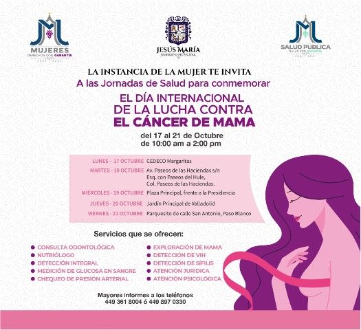 JESÚS MARÍA, AGS.- Como cada año, el Municipio de Jesús María conmemorará el Día Internacional de la Lucha contra el Cáncer de Mama con jornadas de salud que se llevarán a cabo del 17 al 21 de octubre en distintas sedes, las cuales estarán a cargo de la Instancia de la Mujer y la Instancia de Salud Pública.