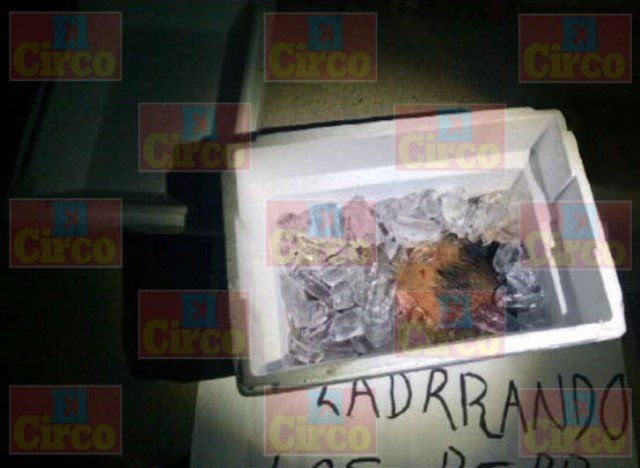 Al lugar se trasladaron de inmediato oficiales de la Policía Preventiva, que confirmaron la presencia de la hielera con la cavidad cefálica junto con el narco-mensaje.