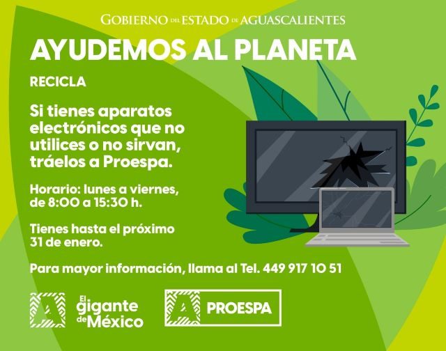 AGUASCALIENTES, AGS.- ¿Tienes aparatos electrónicos que ya no sirvan o estén en desuso? La Procuraduría Estatal de Protección al Ambiente (PROESPA) te invita a sumarte a la campaña de recolección con el propósito de reciclar estos objetos y así cuidar el medio ambiente.