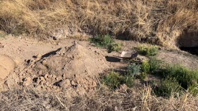 El hombre y su acompañante bajaron a un desnivel a un lado de la terracería mencionada y comenzaron con sus labores, logrando desgajar arena de una pared.