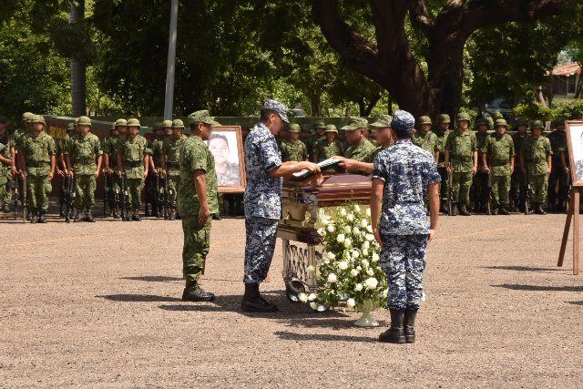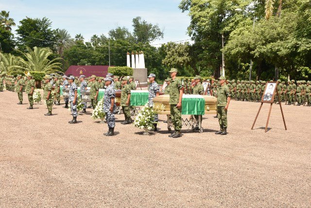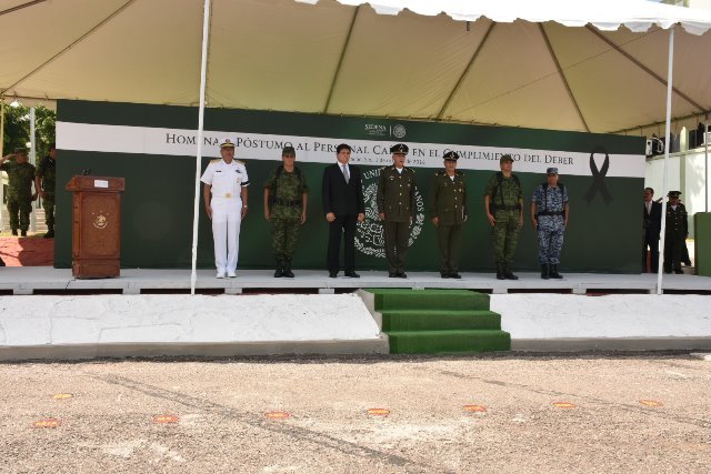 El General Salvador Cienfuegos Zepeda, Secretario de la Defensa Nacional, montó una guardia de honor, expresando a nombre del Presidente de la República y de quienes integran las Fuerzas Armadas, las más sentidas condolencias a los deudos de estos valientes soldados, manifestando su compromiso para apoyarlos y acompañarlos en esta enorme pena.