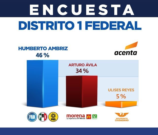 AGUASCALIENTES, AGS.- Humberto Ambriz, candidato a diputado federal por el distrito 1, se coloca al frente en las preferencias electorales de acuerdo a la más reciente encuesta publicada por Acenta, donde el representante de la coalición PAN- PRI- PRD obtuvo el 46 por ciento de la votación.