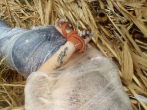 El hombre, que tenía las manos amarradas a la espalda con un cable negro, vestía pantalón de mezclilla azul, sudadera azul, botas industriales en color negro y una bufanda negra.