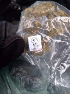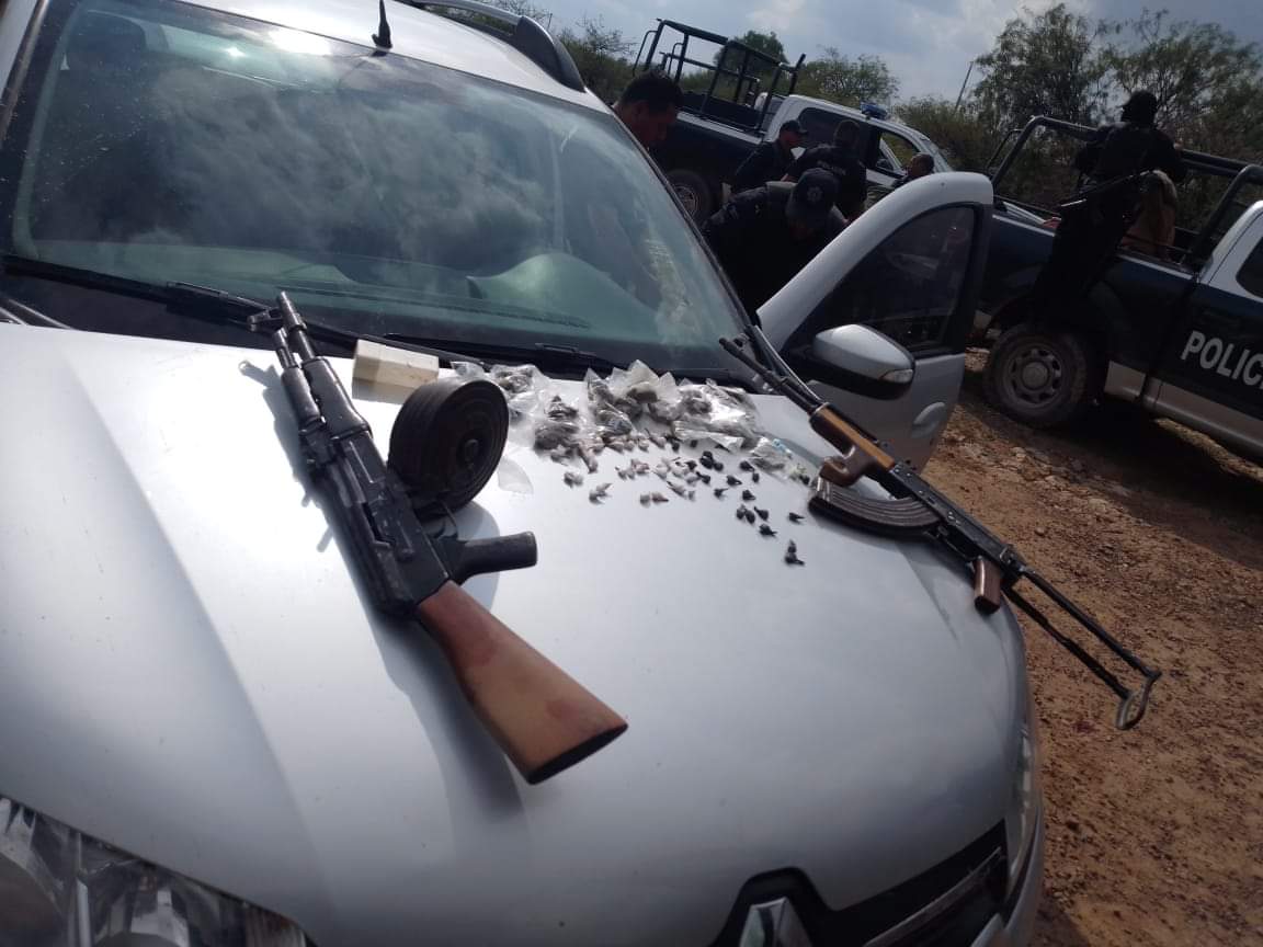 Les aseguraron, además de dichos vehículos, dos armas de fuego largas AK-47 (rifles de asalto “cuernos de chivo”), una de ellas con un cargador de disco y aparentemente abastecidas con cartuchos útiles, así como varios envoltorios con droga que tenían calcomanías del CJNG.