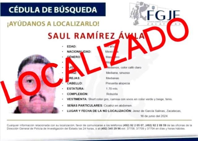 JEREZ, ZAC.- Saúl Ramírez Ávila, de 44 años, quien desapareció el 16 de junio de 2024 en Jerez, es la persona localizada por el grupo de búsqueda en una comunidad del mismo municipio el pasado 27 de agosto.