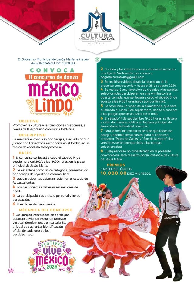 JESÚS MARÍA, AGS.- Para promover la cultura y las tradiciones mexicanas a través de la expresión dancística floclorica, el Gobierno Municipal de Jesús María, a través de la Instancia de la Cultura, invita a los interesados a participar en el II Concurso de Danza “México Lindo”.