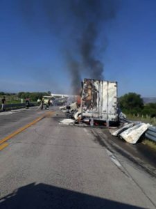 LAGOS DE MORENO, JAL.- La autopista Lagos de Moreno-Ojuelos fue el escenario de un impresionante accidente luego de que dos tráileres chocaron y uno de ellos se incendió.