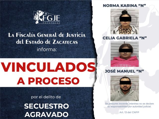 ZACATECAS, ZAC.- El equipo de investigación adscrito a la Fiscalía Especializada de Alto Impacto logró la vinculación a proceso en contra de Norma Karina “N”, Celia Gabriela “N” y José Manuel “N” por el delito de secuestro agravado, como medida cautelar se impuso prisión preventiva y se establecieron 3 meses de investigación complementaria.