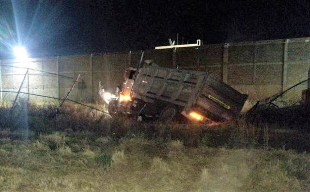 El camión rompió una malla metálica y, al intentar acercarse al muro, cayó en una zanja de la que no pudo salir.