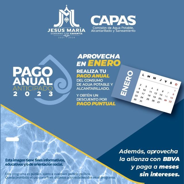 JESÚS MARÍA, AGS.- La Comisión de Agua Potable y Alcantarillado de Jesús María invita a la población a realizar su pago anual anticipado y obtener un descuento directo en cajas.